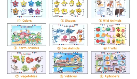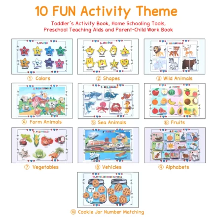 - 10 Montessori-inspired themes: Colors, Shapes, Wild Animals, Farm Animals, Sea Animals, Fruits, Vegetables, Vehicles, Alphabets, Numbers